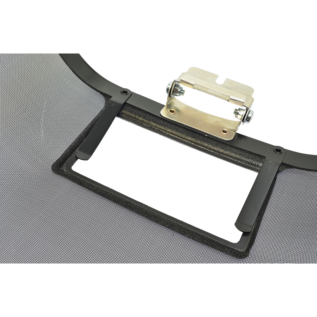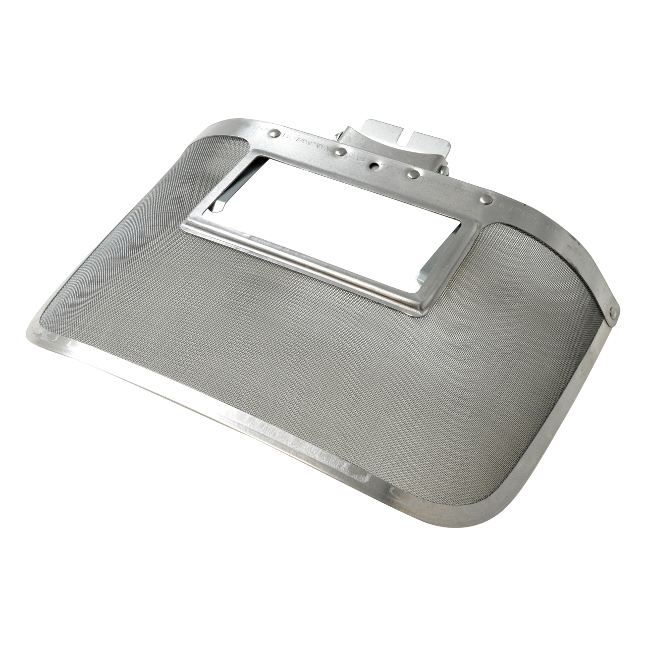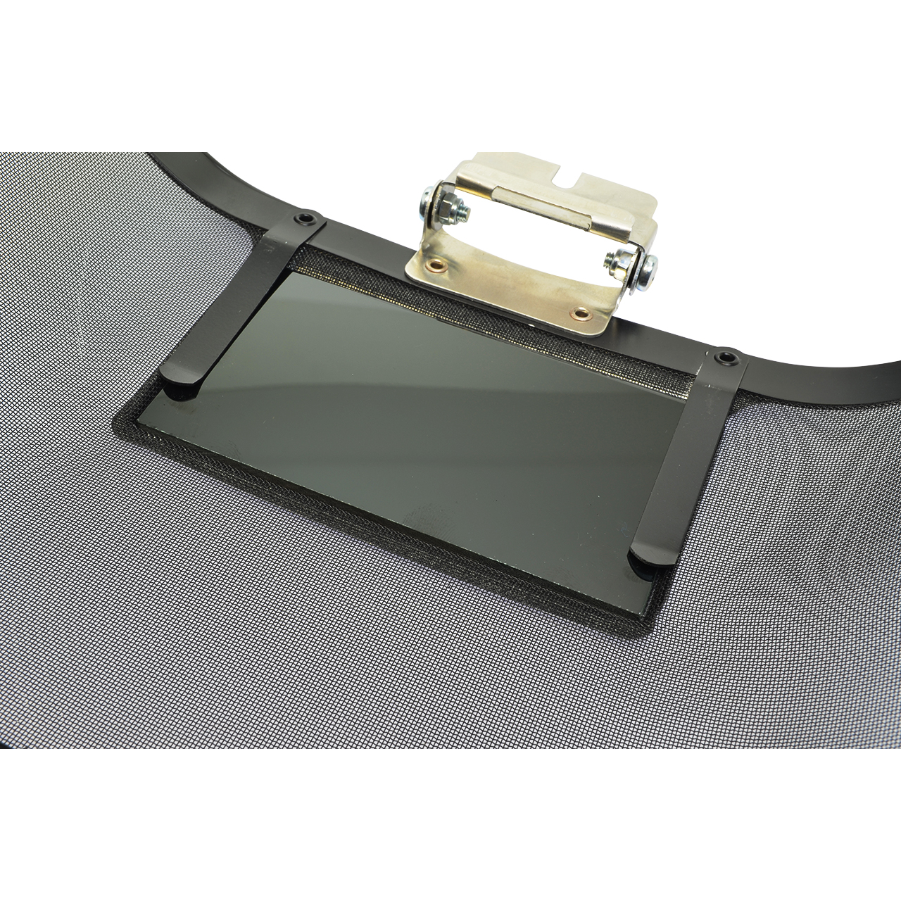 Klappbare Geschichtsvisiere aus verzinktem Stahldrahtgewebe, innen schwarz matt lackiert, umlaufend mit Aluminiumrahmen eingefasst.