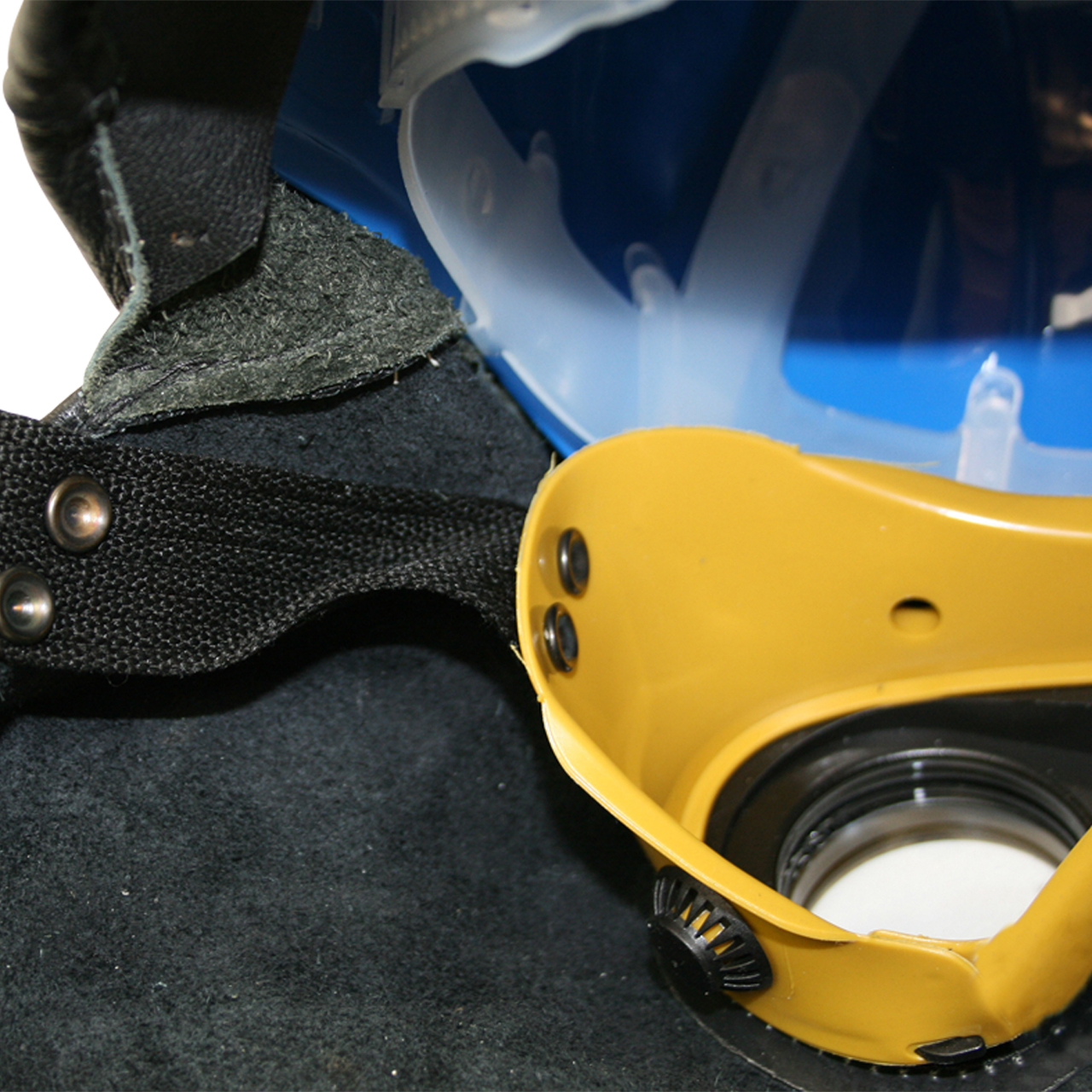 Lederkopfhaube mit Anstoßkappe, mit Nase, hinten offen, Gläser DIN 10