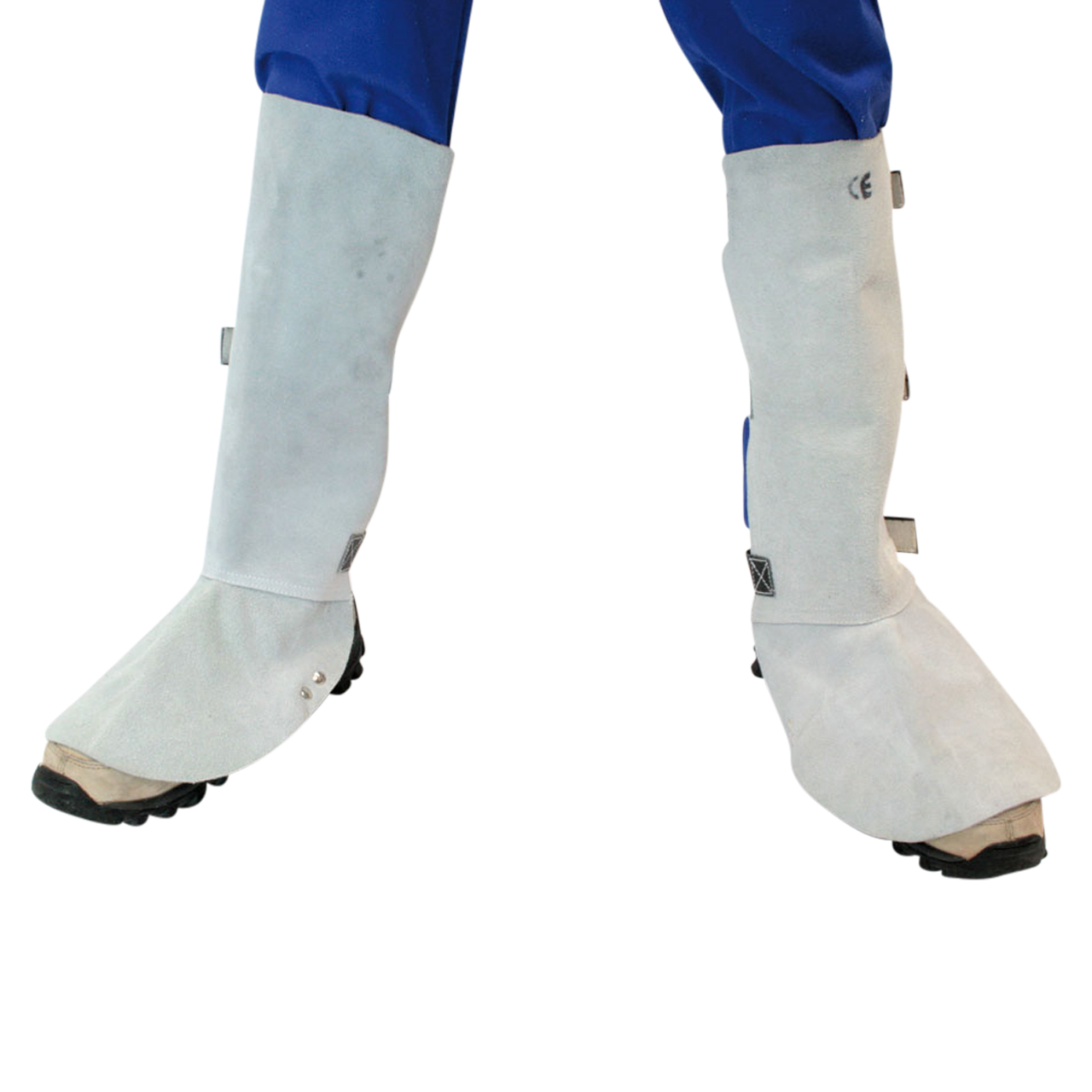 Gamaschen aus Spaltleder mit Klettverschluss (Paar). Das hitzebeständige Spaltleder schützt zuverlässig bei leichten bis mittleren Schweißarbeiten und lässt sich dank des Klettverschlusses schnell und einfach anlegen.