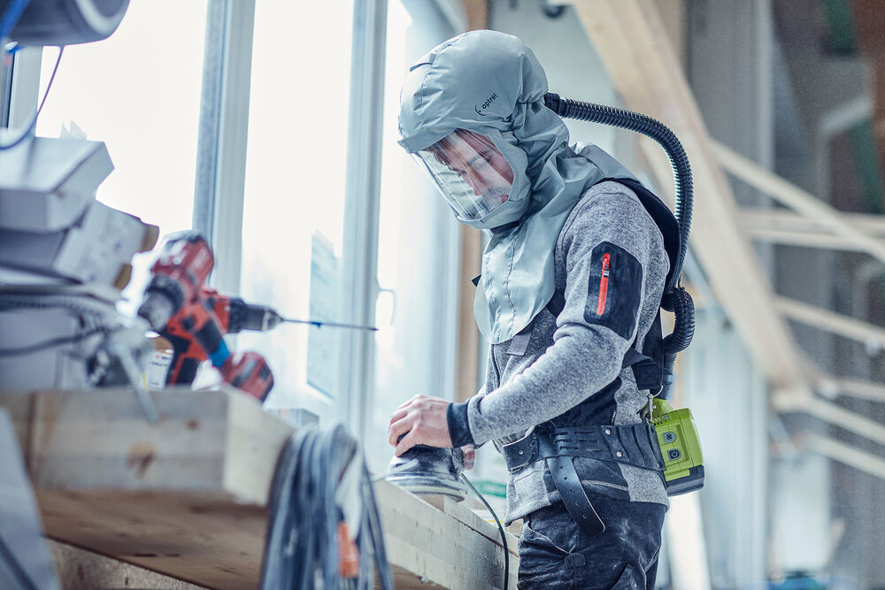 Durch den im Inneren der Haube vorherschenden Überdruck wird verhindert, dass verunreinigte Luft ins Innere der Haube und somit in die Atemwege gelangt.