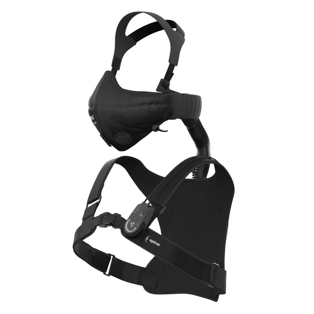 Das nur 48 mm dicke Gebläsesystem mit Ventilator und Filtereinsatz wird wie ein kleiner Rucksack bequem auf dem Rücken getragen und versorgt die aus Hightechmaterial gefertigte Halbmaske von hinten über einen Y-Schlauch mit Luft.