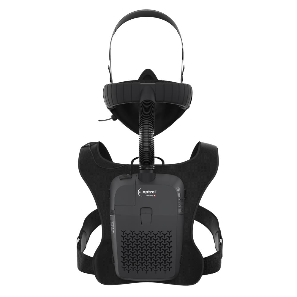 Das nur 48 mm dicke Gebläsesystem mit Ventilator und Filtereinsatz wird wie ein kleiner Rucksack bequem auf dem Rücken getragen und versorgt die aus Hightechmaterial gefertigte Halbmaske von hinten über einen Y-Schlauch mit Luft.