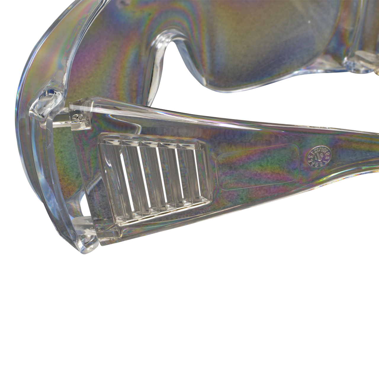Schutzbrille mit Gestell aus glasklarem PC (Polycarbonat) Kunststoff mit klappbaren Bügeln.